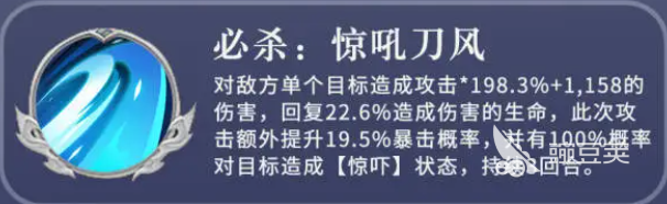 张辽绝对是非常适合用来前期培养后期使用的武将了,他在技能上面第一个必杀技叫做金口刀锋,这个技能是一个单体的目标,对敌人进行输出的时候可以根据他的百分比带来攻击198%左右的数值,而这里的固定伤害数值是1158点的伤害,此时在伤害造成之后,他还可以给自身带来22%左右的恢复效果,这个恢复的数值22%是指的他的伤害百分比,所以伤害数值越高的情况下,他带来的22%生命恢复就越高,此次攻击的话还有一定的额外效果是可以提升张辽自身的暴击概率,提升了19%左右的概率之后,他整体的暴击会有所上升,并且此时百分百触发的一个概率是会给敌人带来一个惊吓的状态,增加的惊吓状态就是一个给敌人的负面影响了。