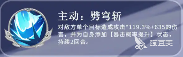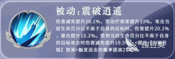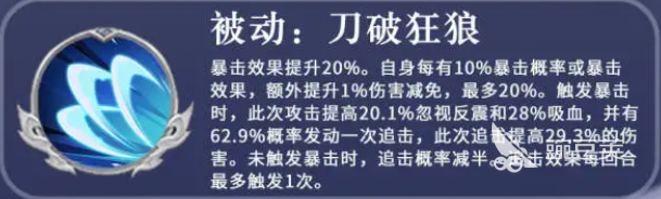 而他的被动技能叫做刀破狂狼,这个技能是给他自身的暴击带来额外提升的,此时提升了20%的暴击之后,他自身还会根据每10%的暴击概率,额外提升1%的伤害减免,当然这个百分比最多是可以叠加到20%的,再提升到20%伤害减免之后,他就无法再进行叠加了,如果这个被动触发了暴击的话,那么此时攻击提升的数值会有20%,最后的数值可以忽视反震,而且他会带来一个吸血的效果,并且有62%左右的概率发动一次追击的能力,这一次追击的话,还会提升自身29%的伤害数值,如果这个技能没有触发暴击的话,那么追击触发的概率就会减掉一半,这里的追击效果其实在每一个回合里面都是可以进行尝试触发的,但是一个回合只最多只能用一次。