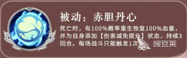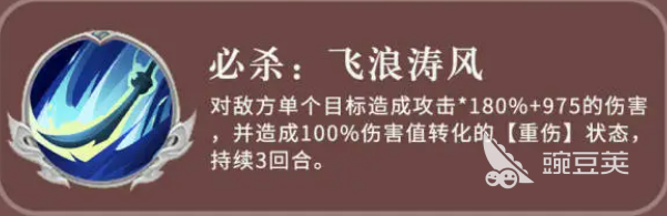 所以在需要攻击的时候周泰是可以针对敌方输出进行主要攻击的,他在技能上面有一个必杀技,叫做飞浪涛风,使用这个技能的时候,是针对敌方的一个目标进行攻击,这里的攻击百分比达到了180%,然后加上975点的固定伤害,此时还会有百分之百的伤害可以进行转化,转化的能力就是一个重伤的状态施加给敌人,在敌人身上重伤的状态会影响后面三个回合的掉血效果,那么他在被动能力上面还有一个赤胆丹心,这个技能就是周泰在被敌方击杀并导致死亡的时候,有百分百的概率会重生。