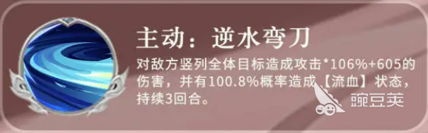 当然,重生的效果是每一场战斗里面最多只能使用一次的,此时在重生了之后,他自身的血量数值是会达到百分百恢复的,所以是又重新回到了巅峰状态当中,此时,他给自身添加的增益效果是一个伤害减免提升的效果,所以,如果是重生后的状态进行输出的话,是非常有优势的,当然这个效果也是可以持续3个回合给他带来足够争议的,那另外一个主动技能叫做逆水弯刀,这个技能是针对一个数列的敌人目标进行攻击,所以也算做一个群体的攻击效果,带来的百分比是106点的攻击伤害,加上固定的605点伤害数值,并且此时的话,也会有100%的概率可以造成流血的状态。