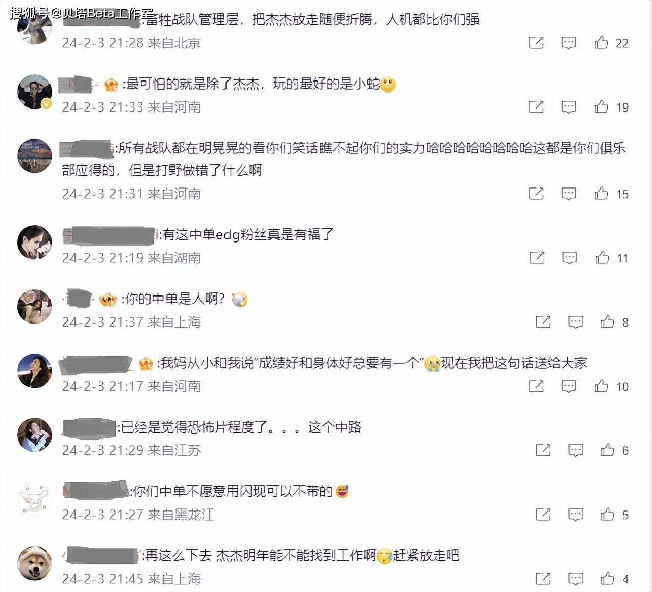 EDG官博下方的评论如下,不少粉丝都在心疼jiejie,很多人喊话EDG管理层:放了jiejie吧,再这么打下去,可能他明年都不一定找得到工作了,还是现在让他走吧!也有粉丝怒斥中单Fisher:为什么不交闪现?有这种中单,EDG不可能有成绩。也有粉丝阴阳怪气:所有战队都在看你们的笑话,都是你们俱乐部应得的。