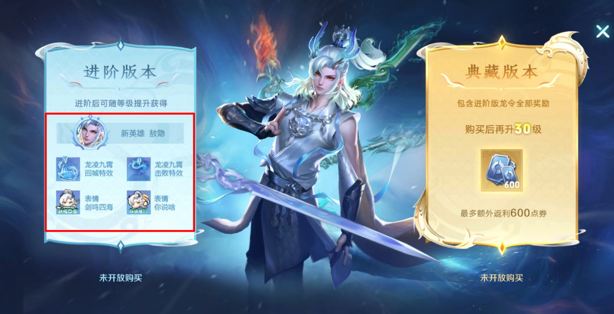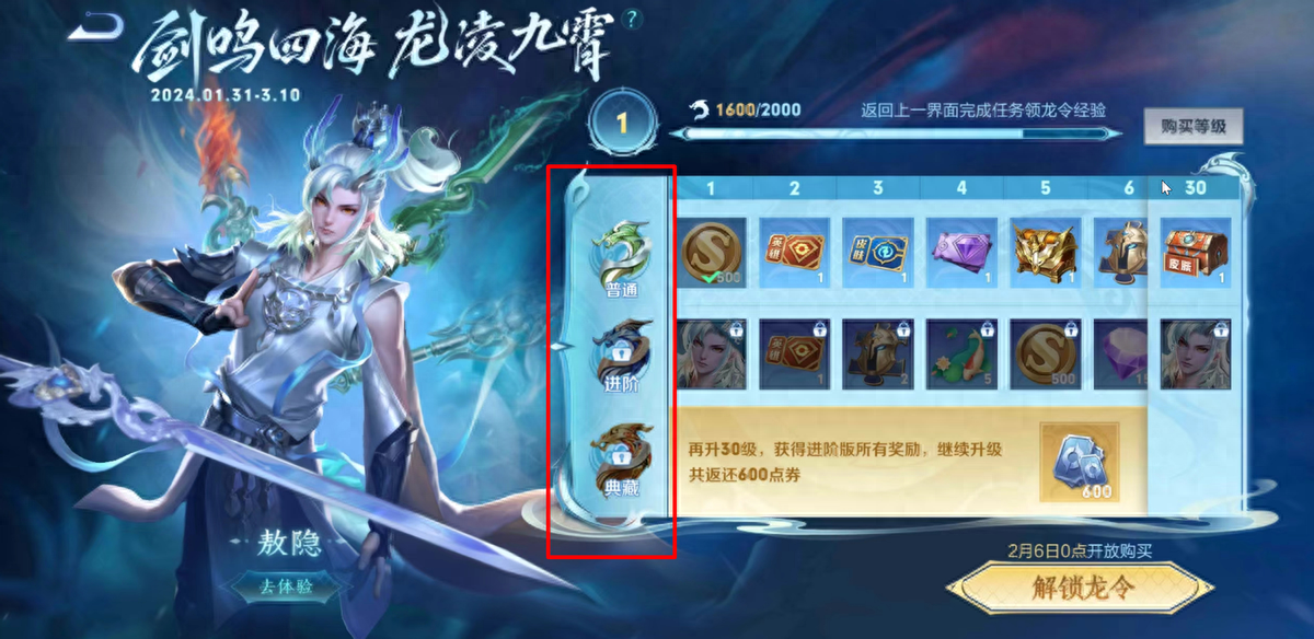 龙令任务分为三个等级,分别是普攻、进阶和典藏。普通任务只能获得一些道具奖励,还有英雄和皮肤,新英雄敖隐只能体验一天。进阶任务能额外获得一些道具,还有敖隐的击败特效以及静态表情,通过升级,最终玩家会获得敖隐新英雄,不过玩家需要花费388解锁进阶任务。最后是典藏,这个就厉害了,988点券敖隐直接送,玩家还能额外获得敖隐回城特效以及剑鸣四海表情。