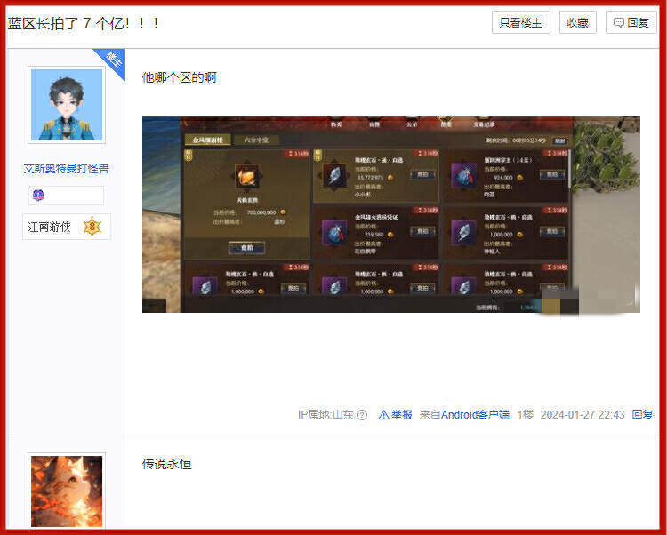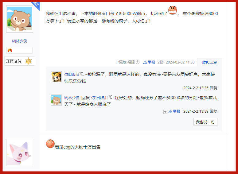 这位原本激动到手抖的萌新,发现一夜暴富的机会,就这么从自己指尖溜走之后,立马气得当场破防,专门把这件事情分享了出来,直言:逆水寒玩家全都是一群有钱的疯子!