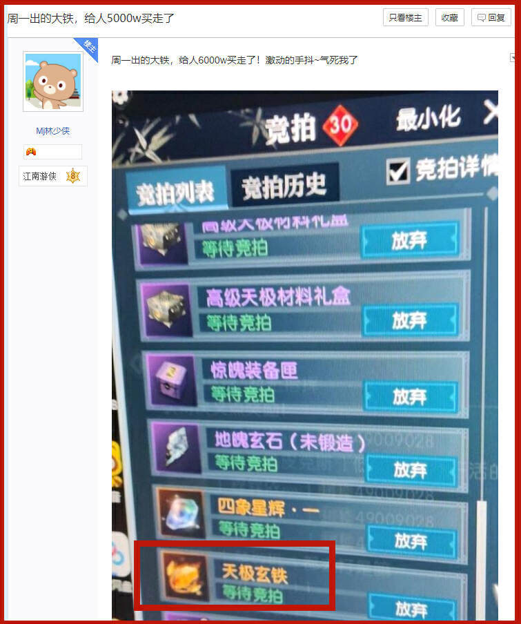 不知道大家玩逆水寒这类可以自由拍卖顶级材料的MMO网游时,遇到被人捡漏的事情之后,有没有像这位萌新一样,事情过去了整整一周,还无法释怀呢?