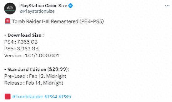 推主PlayStation Game Size带来了《古墓丽影123:复刻版》PS平台容量情报。PS4版大小为7.365GB,PS5版为3.963GB。预载将于2月12日开启,2月14日正式推出。