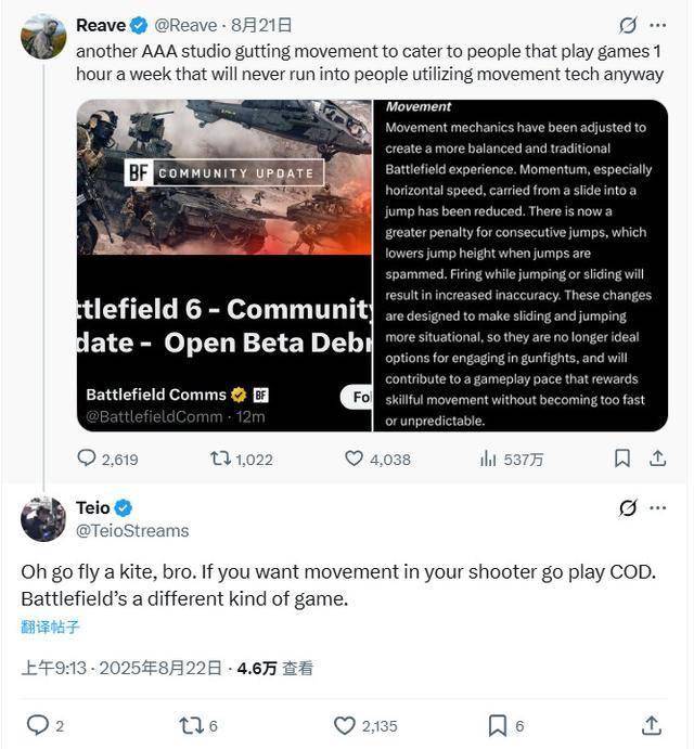 另一位内容创作者@TeioStreams则回怼:“去放风筝吧兄弟。如果你想玩高机动射击游戏,就去玩COD。《战地》是另一种类型的游戏。”