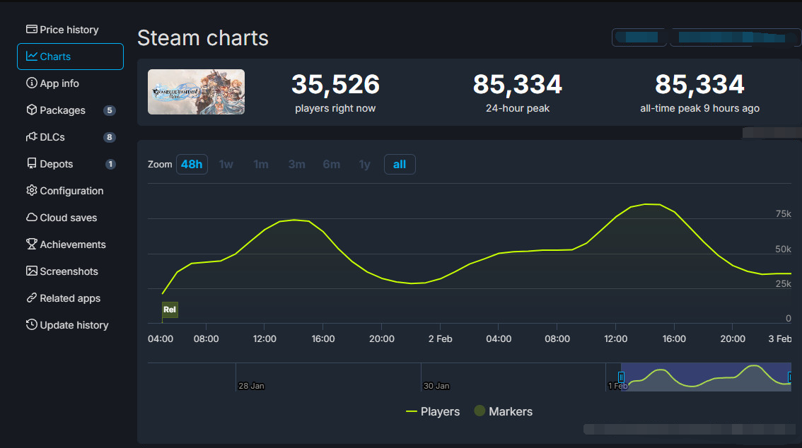 据SteamDB数据显示,《碧蓝幻想:Relink》在Steam平台上的表现尤为抢眼,同时在线峰值超过8万人,这一数字几乎是同期发售的另一款日本游戏《如龙8》的两倍。值得一提的是,《碧蓝幻想:Relink》的国区售价为298元,相较于其他大作而言,这一价格也相对亲民。