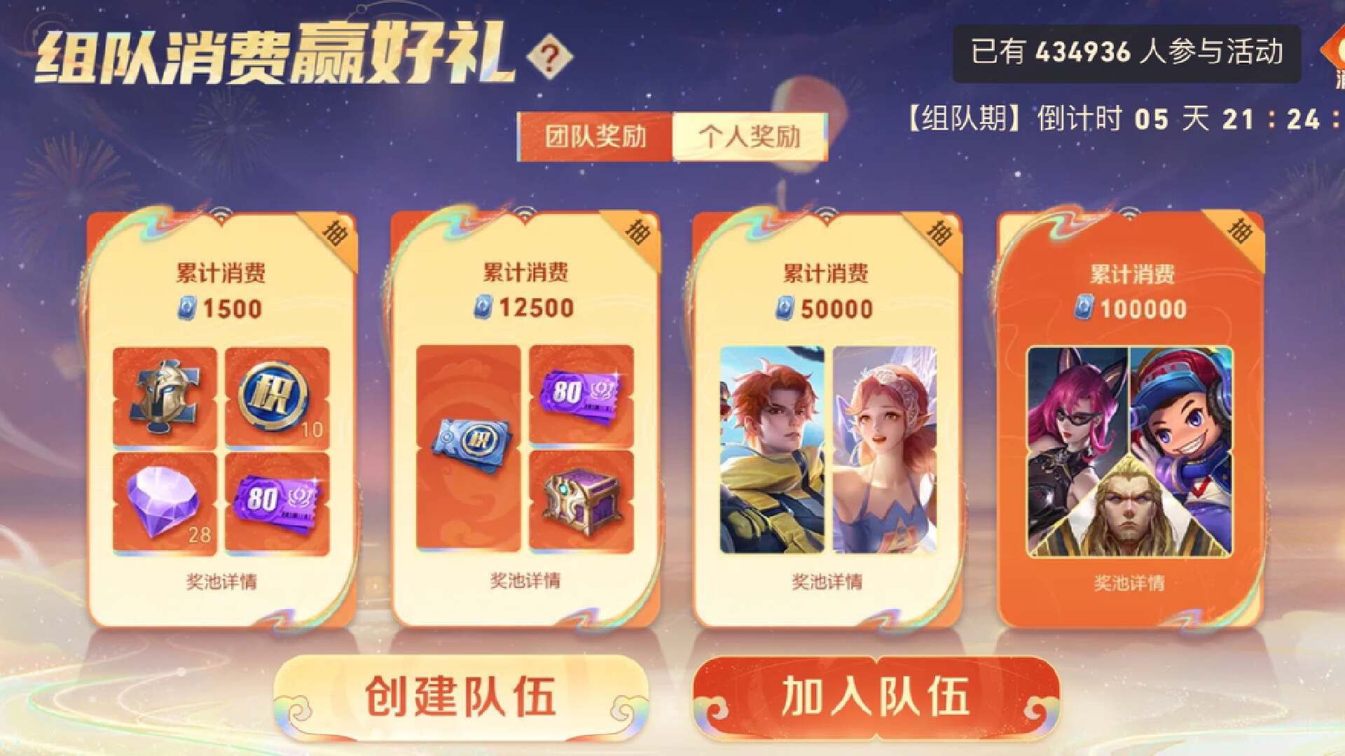 最后就是近期组队消费活动非常的火热,在近期官方也是给了玩家们组队的时间,最高一支队伍可以包含20位玩家,20位玩家在活动期间如果总共消费了100000点券,就可以领取相关的奖励,比如阿轲的暗夜猫娘、鲁班的电玩小子这几款皮肤都算是比较高级的史诗皮肤,价值也就在2888点券。