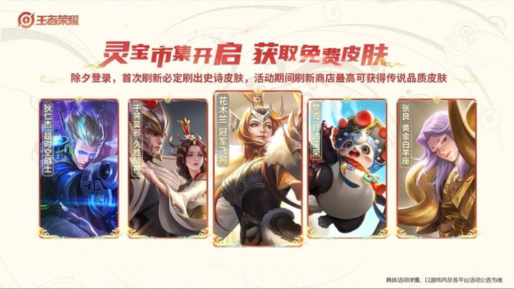 并且玩家在除夕登录游戏,首次刷新就会必定刷新出史诗皮肤,而且在活动期间也有概率获得传说皮肤的,比如花木兰的冠军飞将、梦奇的胖达荣荣等。