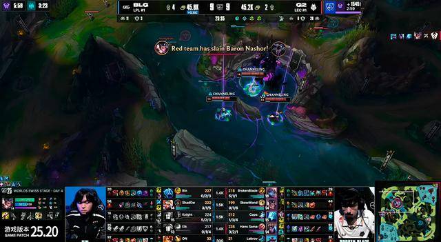 前期拿到的优势被G2扳平,进入中期BLG频频发起抓人的小团,但并没有继续取得优势,反而是野区资源全被G2拿到,三条小龙与峡谷先锋。20分钟BLG在下路抓到Caps凤凰,但此时G2四人rush掉厄塔汗。小龙刷新双方在抢视野,Shad0w出现失误被G2集火秒掉,ON随后也阵亡,G2控下炼金龙魂。