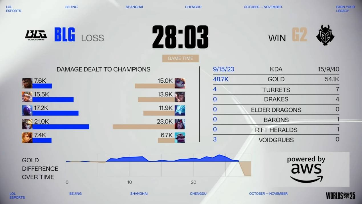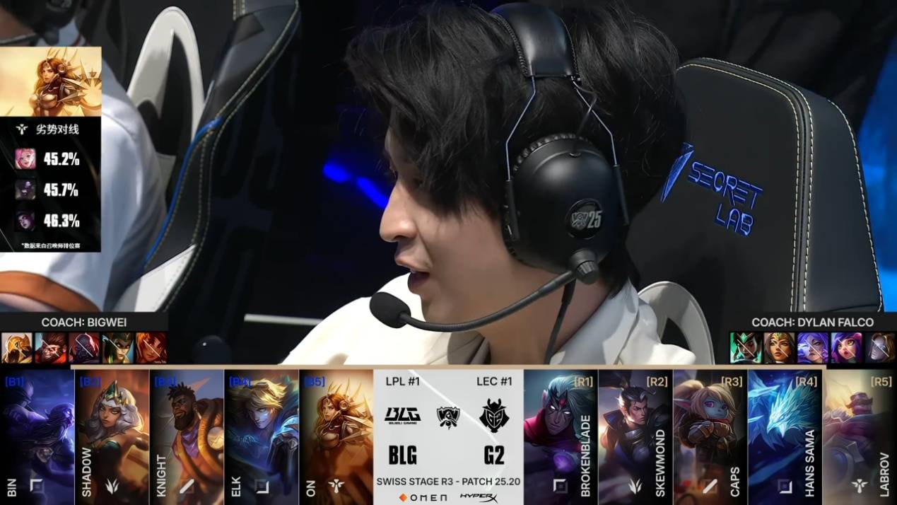 S15全球总决赛瑞士轮的比赛在今天进行了1-1组别的战斗,结果LPL赛区的关键一战中,BLG再次发挥失常不敌欧洲老牌强队G2,落入淘汰轮。