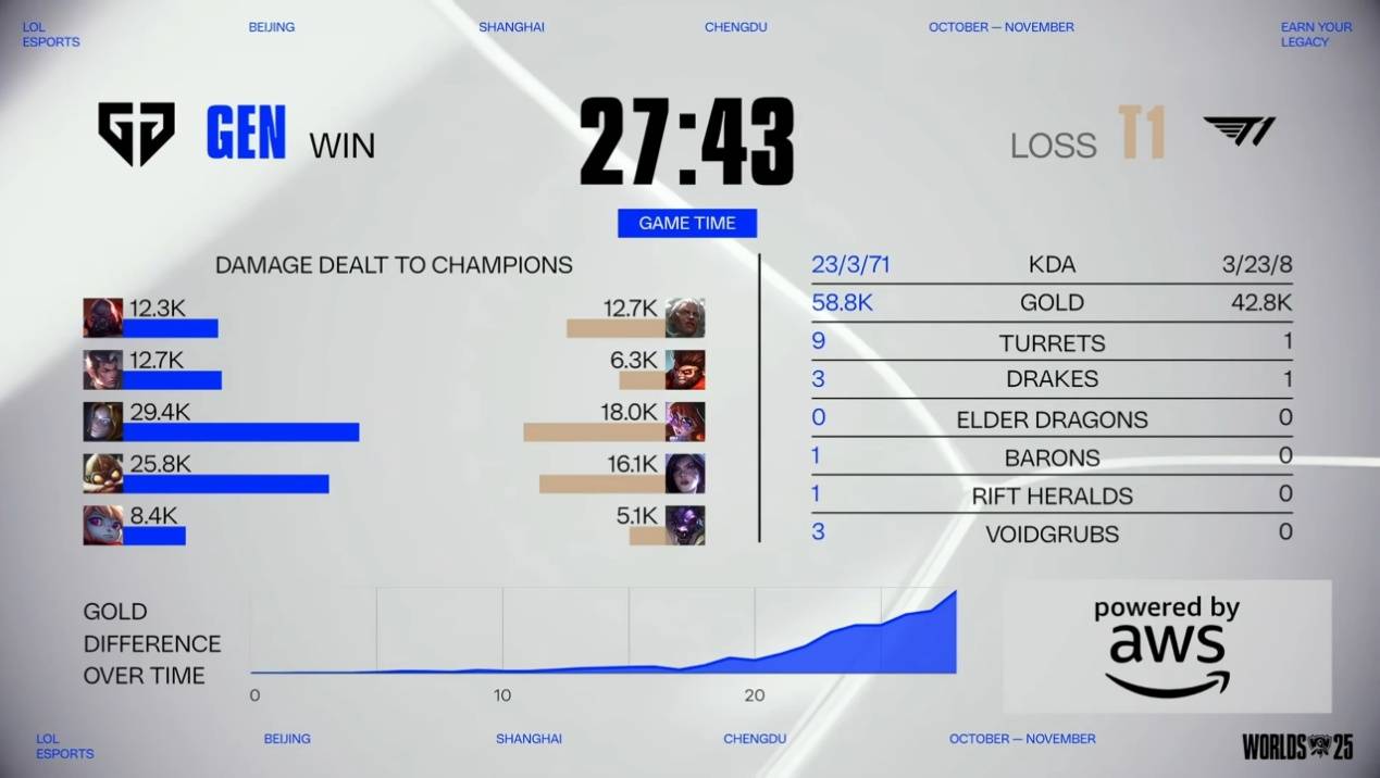 后面的对局沦为垃圾时间,过程中GEN多人追击Faker,Faker一顿操作后被Chovy闪现大招拉回后阵亡, T1全员都知道这场大势已去,开启了大火收汁模式,与GEN连续接团被GEN轻松干碎。