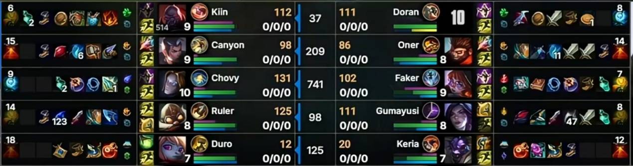 结果比赛局势的发展比BP的差距还要更大,Faker对位直接被Chovy打穿,被彻底压制,仅仅12分钟对位就落后三十刀,而在关键的小龙团战中,Faker的发挥更是离谱,辅助Keria进场开团后,Faker开启大招后直接冲入人群送掉自己的人头。