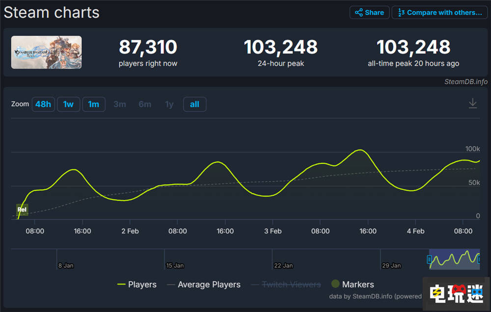 《碧蓝幻想Relink》这款Cygames花了8年多开发的游戏,如今在发售3天后,Steam版的游戏玩家在线峰值就已经达到103248人,对于一款Steam上的JRPG来说算得上是开门红了。