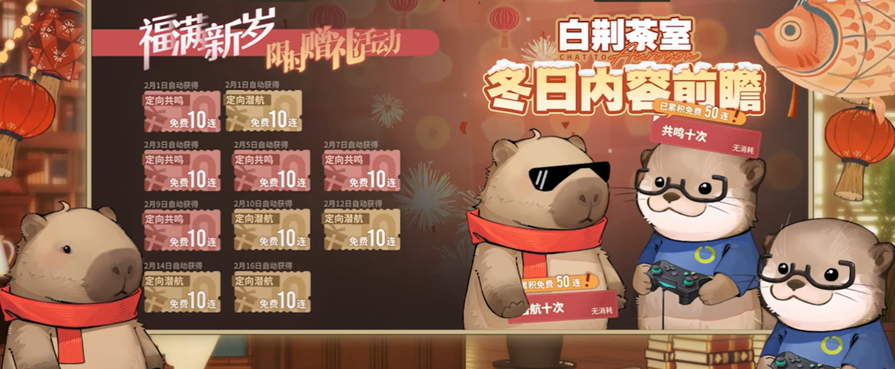 可以说,不断深入研究白荆玩法,也是一个获得成就感的过程。而如果想要尝试入坑,现在正是最好的时机——新年将至,《白荆回廊》推出了全新的春节版本,登录即可白嫖50抽烙痕+50抽角色,加上活动商店开放一共是110抽,新人玩家更是直接加码至210抽。此外,新版本还进一步调整了新手成长奖励,玩家通过主线剧情达到20、30级时,将会获得总计6名五星角色、3名四星角色,助力更快度过新手期,对于小白玩家十分友好。