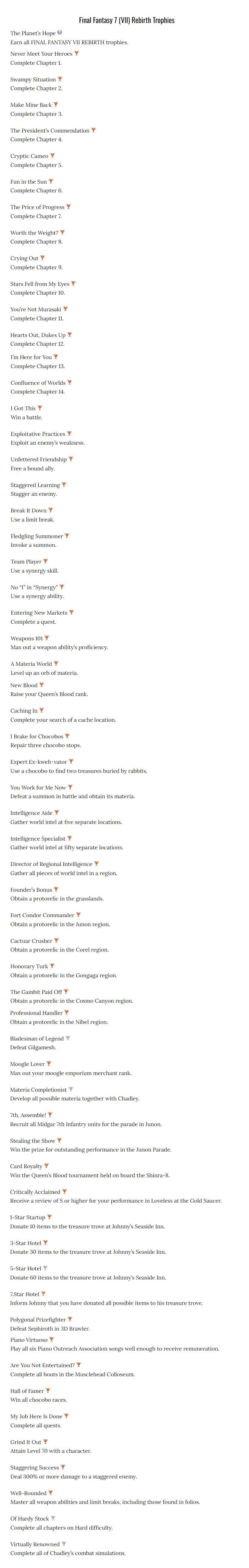 原标题:《最终幻想7:重生》奖杯列表曝光 包含难度奖杯
