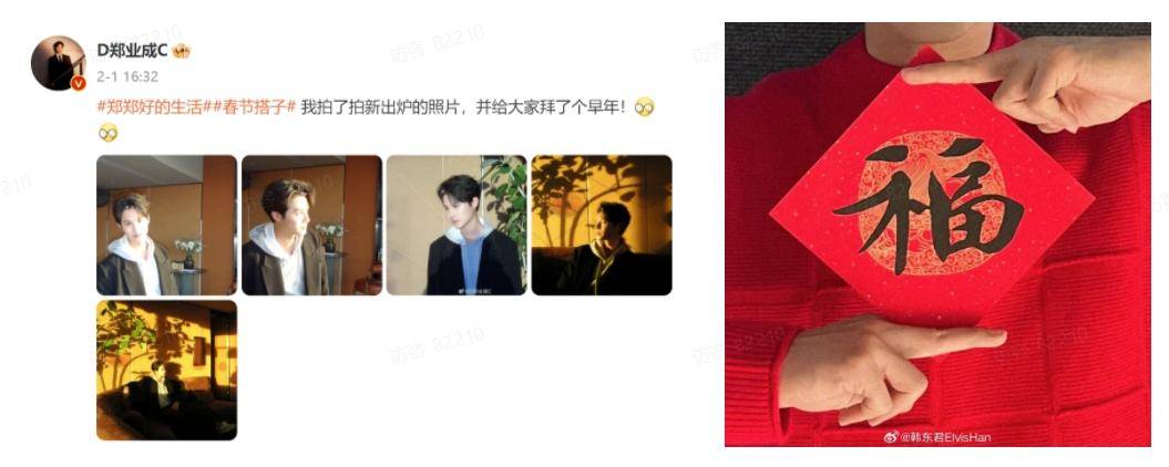 在高质量革命题材历史剧《问苍茫》中出演周总理一角的郑业成,也是在个人微博中晒出了自己新出炉的照片,以“春节搭子”的身份给大家拜个早年,帅气的脸庞与氛围感十足的照片构图,显然也是其粉丝们带来满满的福利。同为“春节搭子”的演员韩东君,也是在微博中晒出了属于自己的迎福姿势,并且邀请粉丝们将自己独特的迎福姿势分享大家,把春节的喜庆传递开来。