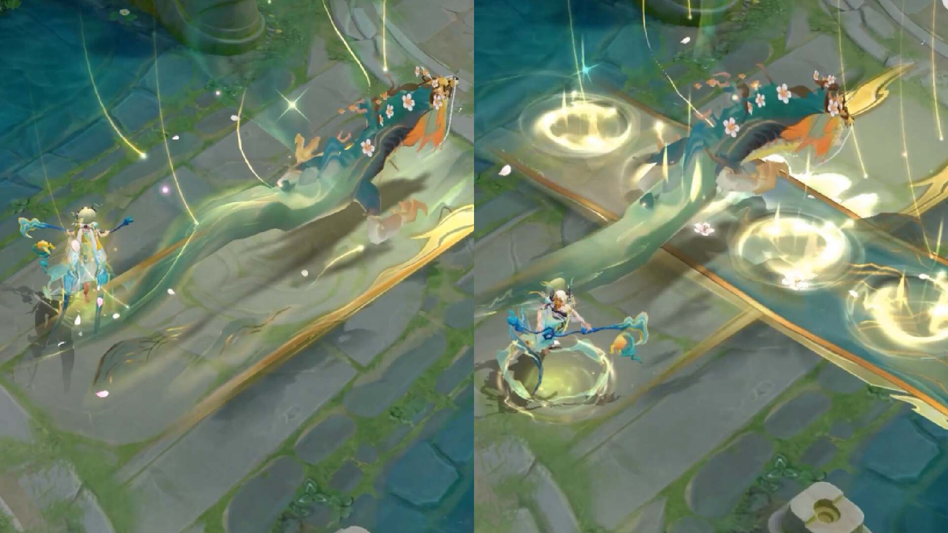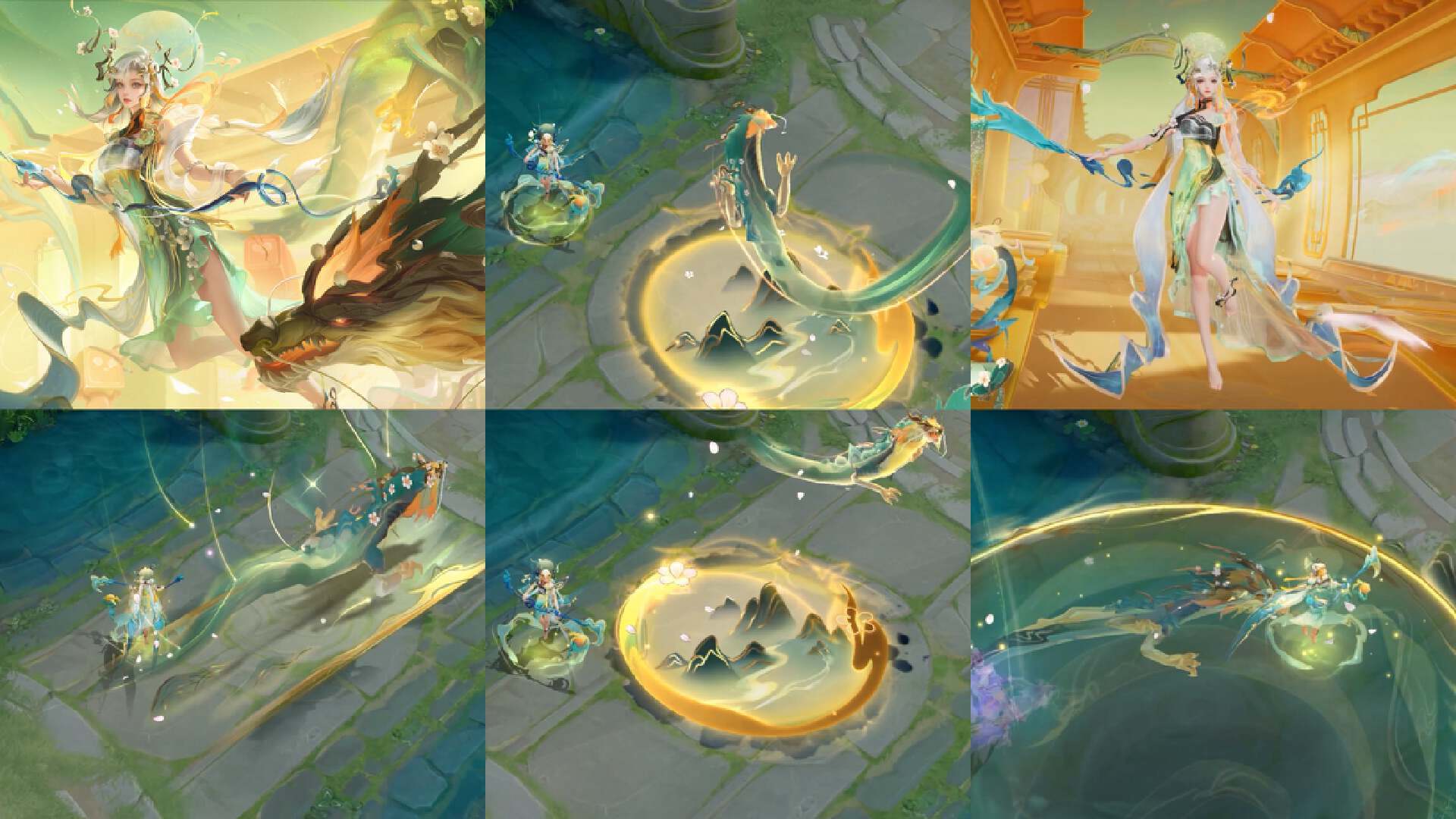 大乔的新皮肤特效主要展示了山河画卷,以及神龙元素,比如释放一技能之后,除了地面上有一些细微的山河纹路之外,还能看到一条龙。