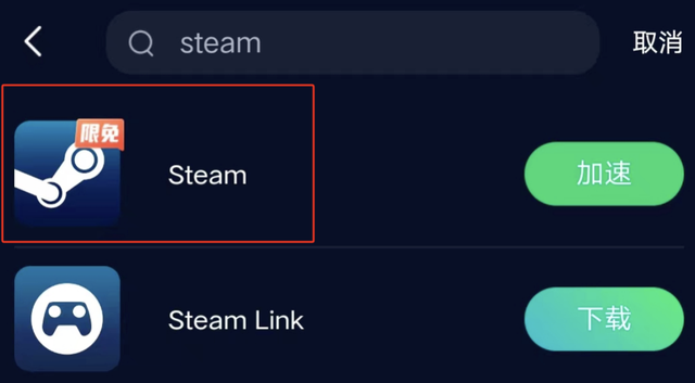 接下来,我们进入到迅游手游加速器中搜索steam并加速,就可以用手机登录steam了,随时随地喜加一、清空购物车~