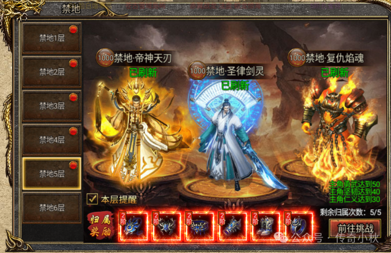 想要获得永霜装备,只有在【传奇大陆】禁地地图中击败boss后有几率掉落。禁地分为很多不同的层数,每层boss难度不一样、归属奖励不一样、进入的条件也不一样。禁地前三层都只需要开服时间达到8天即可进入。后面的层数需要主角的勇武、坚韧、仁义属性达到要求。(永霜装备会提供以上属性)