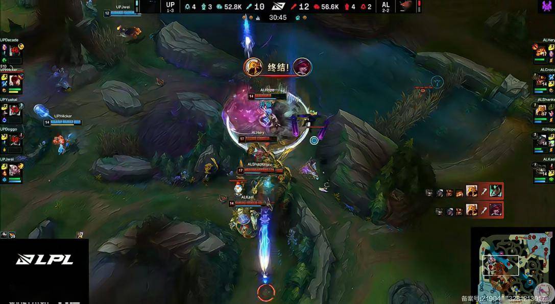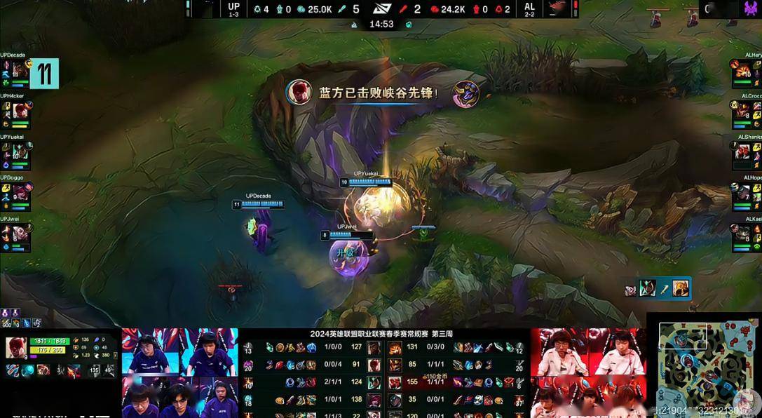 今天UP和AL年前的最后一场比赛,双方打满Bo3,在最后一局H4cker前期盲僧节奏完美,前15分钟90%的参团率4助攻,控先锋,UP一度优势很大,结果这15分钟之后,味道立刻就变了。自身不再有节奏的同时,队友接团非常急躁,被AL连续几波小团灭之后,25分钟开始全面溃败。