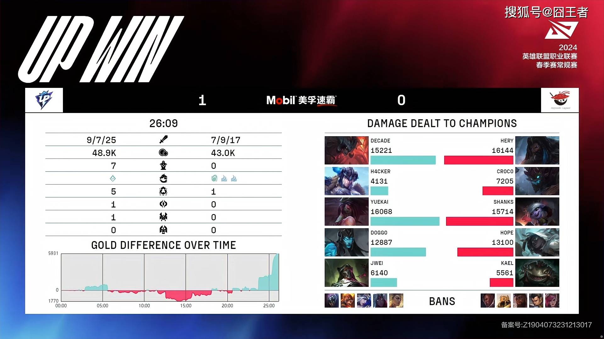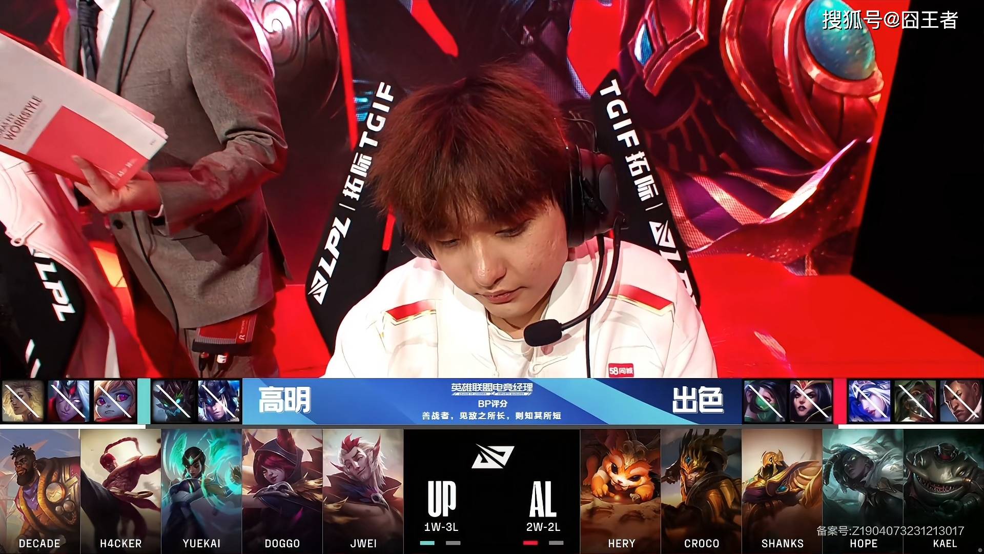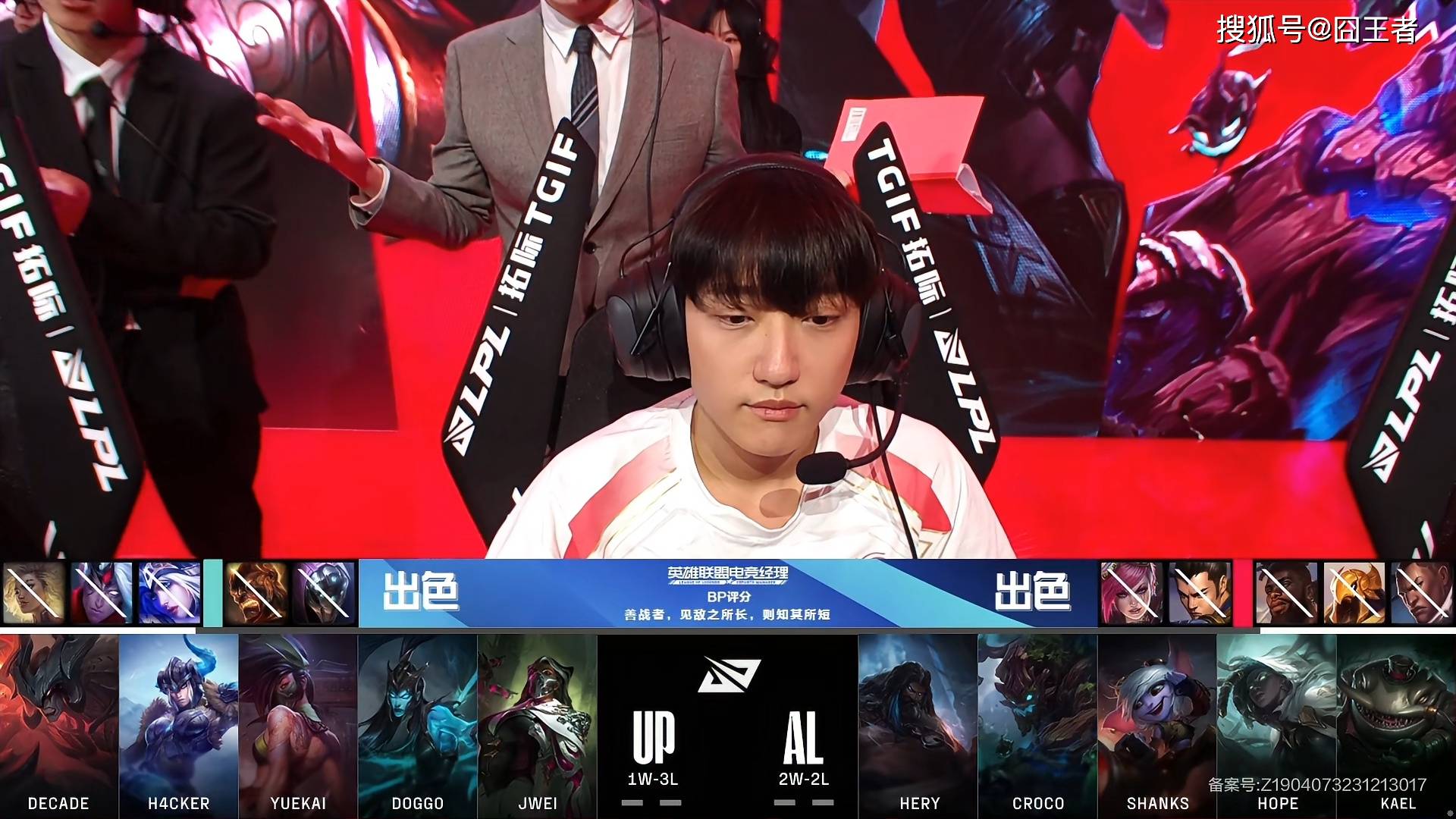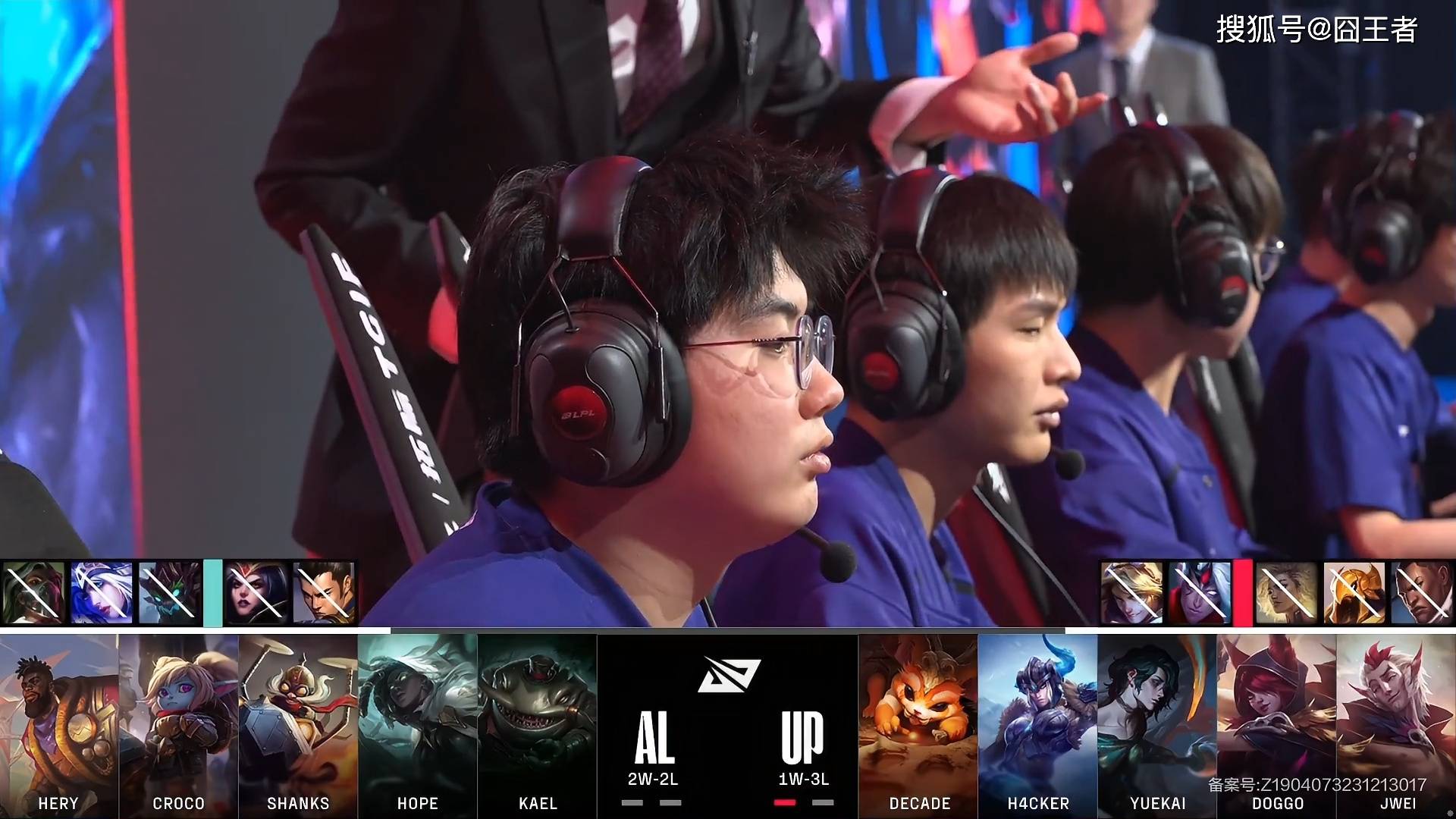 决胜局,UP蓝色方,禁用:芮尔、韦鲁斯、波比、茂凯、猪女,选用奎桑提、盲僧、卡尔玛、霞、洛;AL红色方,禁用卢锡安、烈娜塔、艾希、妖姬、阿卡丽,选用纳尔、皇子、沙皇、赛娜、塔姆。