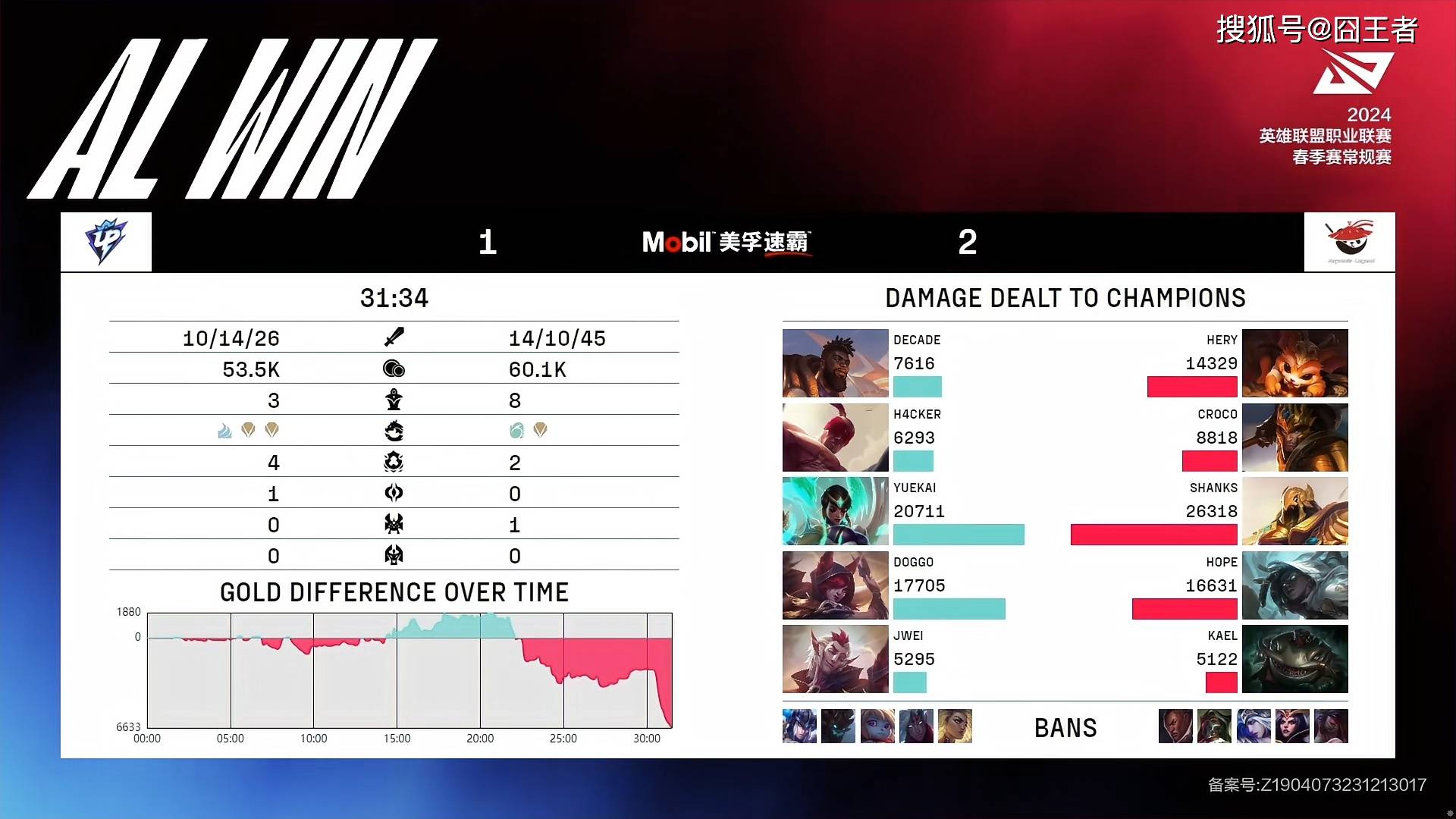 结果决胜局的比赛,两队打出了一场翻中翻的对局——前15分,AL利用一血的优势,占据场面优势,打出了些许经济优势;15到22分钟,UP利用峡谷先锋,小龙和大龙资源,搬回经济并反超近2000;正当绝大多少玩家以为Up会翻盘获胜时,战局又出现反转。26分钟左右,霞拿下双杀的赏金被赛娜拿下,随后AL吹响了反攻的号角。最终31分34秒,AL双C完美配合打出巨额伤害,击杀UP三人后,中路一波赢下比赛!