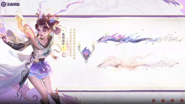 角色建模,龙通常和天空联系在一起,孙尚香建模上用到了星辰元素,龙纹体现在衣服上,展现出“暮山紫”配色。经常看神话剧,大家应该听说过“紫气东来”的成员,此时的孙尚香就是最好的体现。她的胸口处有抽象星图,肩膀处有彩色云彩,群则为紫色星云,发型盘旋起来,代表彩色祥云。武器有昼龙和夜龙两种形态,局内会自由切换,显示的配色不同,相当霸气。