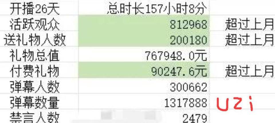 礼物总数将近100万,付费礼物高达33万,这个数据是比uzi还高的,而且直播时长还没有uzi长,这里面有一个很有趣的数据,那就是禁言人数,theshy直播间的人数并没有uzi多,但是禁言人数却是uzi的两倍。