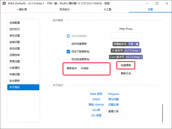 第五步:启动MAA小助手,在MAA主界面-设置-关于我们,将更新版本改为内测版后,点击检查更新,将MAA版本更新至v5.1.0及以上版本(内测版不够稳定,请持续关注及时更新版本)。