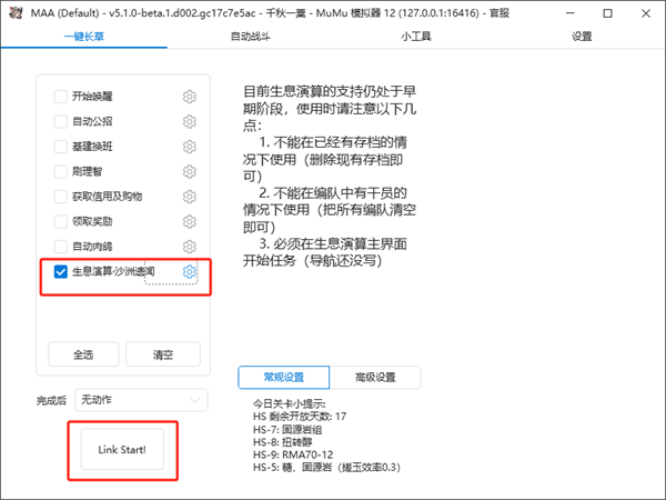 第七步:点击MAA左上角的【一件长草】,勾选【生息演算·沙洲遗闻】,并点击下方的【Link Start】按钮,就可以开始自动通关《沙洲遗闻》生息演算了。