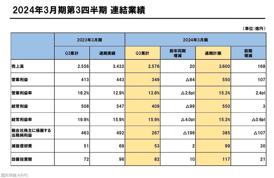 Square Enix今日公开23-24财年Q3财报,本财年截止至Q3(23年4月~12月)销售额2576.12亿日元,同比增长0.8%,营业利润349.18亿日元,同比减少15.5%。