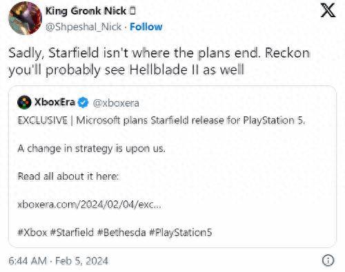 Xbox Era联合创始人尼克·贝克在推特上表示:“《星空》并非计划的终点”,并且他认为“你很可能也会看到《地狱之刃2》。”