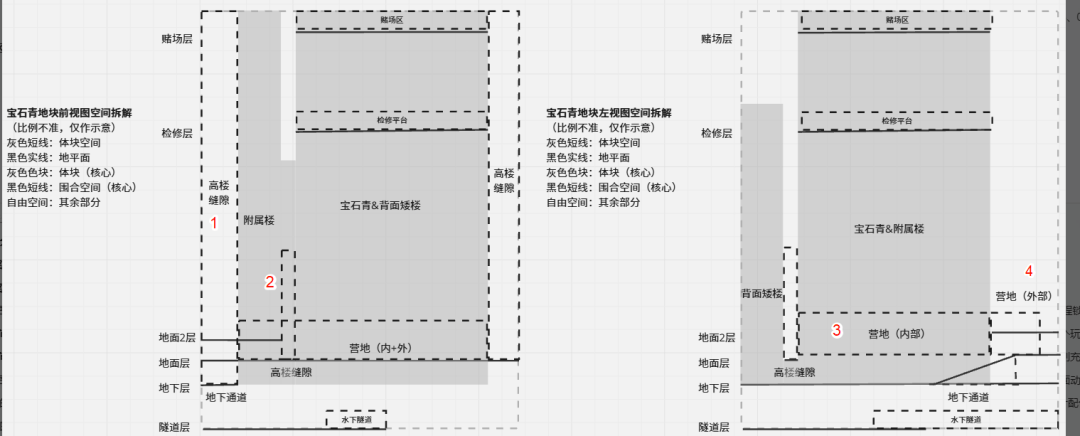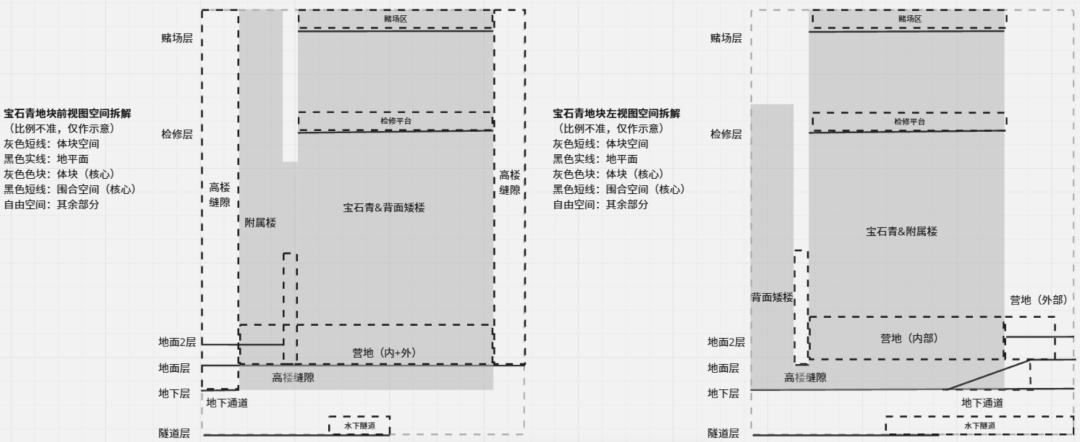 4. 不同的空间形状适合不同的功能。请看上方表格“地块前视图和左视图”,高楼缝隙和营地的对比。两者都属于城市尺度,一个细而高,一个宽而低。显然前者更偏向视觉表现:因为垂直移动手段较弱,反复抬头体验也不好。后者更偏向成为一个玩法空间。 (仅仅是偏向,实际上垂直空间做探索效果很好)
