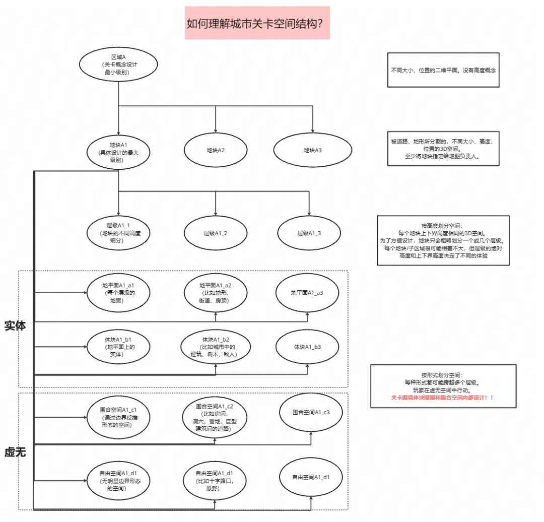 此外,我们再引入层级概念来辅助拆分垂直结构。通常围合空间、实体周围的自由空间可以更好的作为关卡容器。
