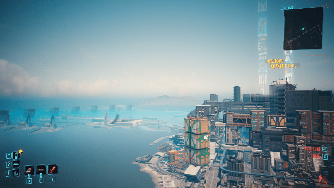 图1:这张图拍摄于宝石青的顶层,能直接看到远处的海洋和隐隐约约的大坝、上方的天空。右侧的海岸有建筑群,但我明显处于更高的位置,在远处有直指天空的特效。