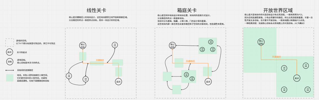 每个关卡设计师都会提到这三个名词,但在实际的工作中,我发现大家对这些词仅有一些模糊的概念。设计师们在玩游戏时能分清类型,却很难自己说清楚,如果我们想融合两者不同类型的关卡体验,首先就要思考它们三个名词的区别。下面是我自己的一些思考: