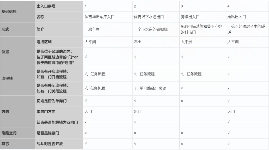 可以看到这四扇门的形式、功能差异很大。既有隐藏门也有上锁门,既有一次性门也有永久门,既有单向门也有双向门,既有任务门也有大世界门,既有位于边界的门也有位于区域中的通道。使用4扇门能做出如此差异化的体验真的厉害。