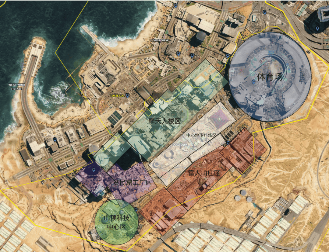 实际体验中,狗镇的摩天大楼区、中心地下广场区、富人山庄区的主路网开放感很强。贫民窟工厂区、山顶科技中心区的主路网比较强,体育场则是室内区域,没有开放感。