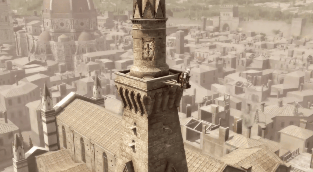 刺客信条系列鸟瞰点体验,鸟瞰点720°的球面角都能提供开放感。图片来自网络