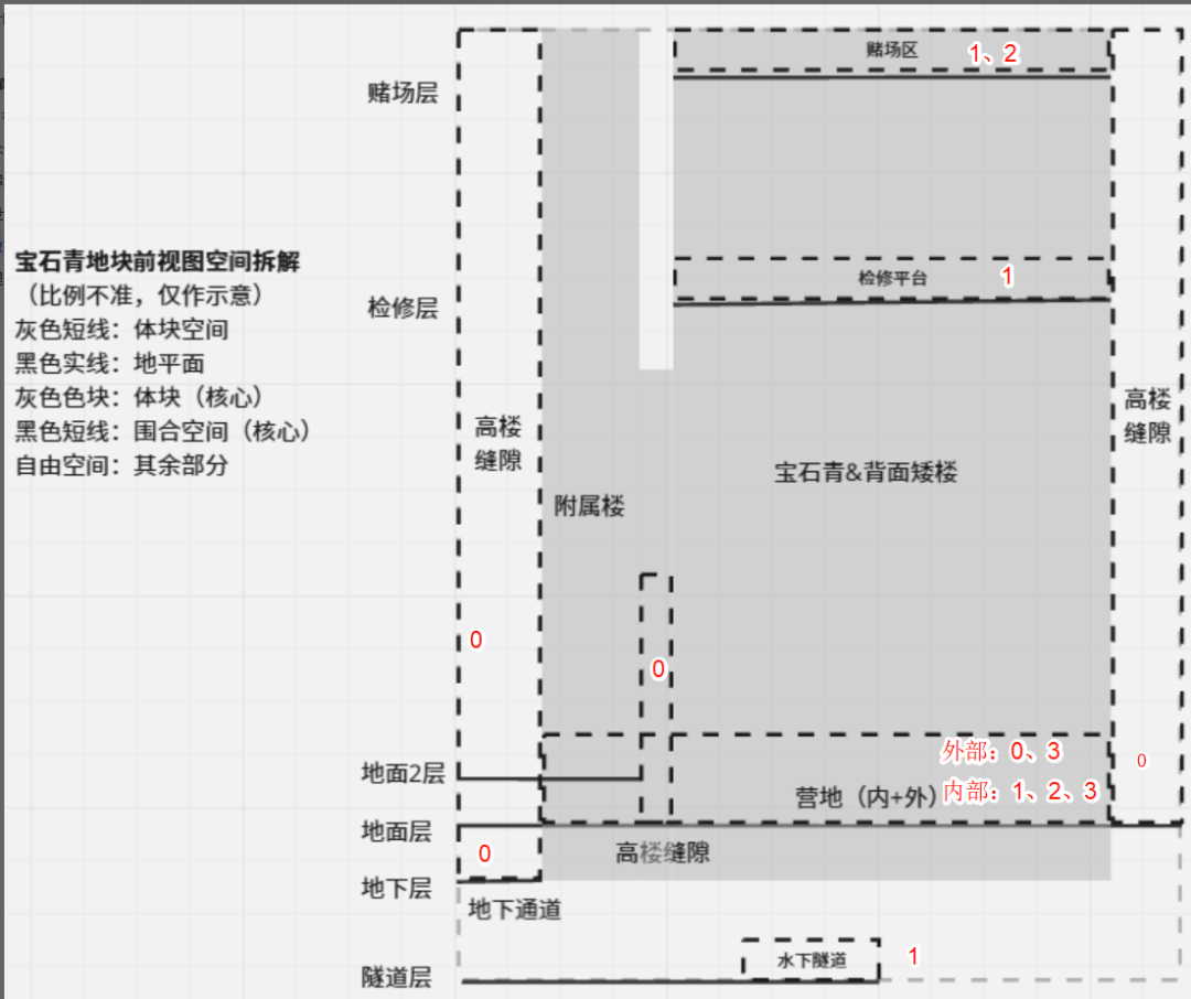 我们从它的空间结构、流程设计两方面讨论一下狗镇地块的设计思路——下面均以摩天大楼区的宝石青地块为例。