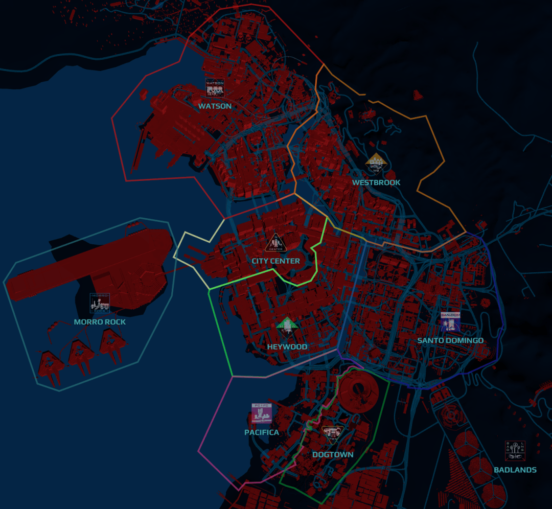 区域定义为夜之城最高层级的区块划分。在2077中共有9个,见下图。