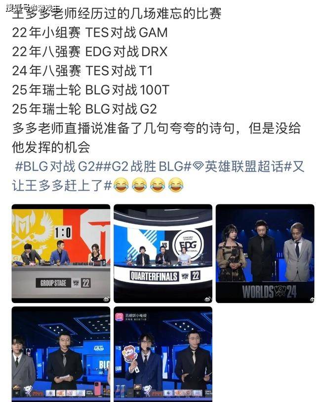 这一次世界赛最惨的官方解说应该就是王多多吧,Blg战队的比赛他解说了两场全部都输了。作为电竞诗人的他,肯定准备了很多的华丽的诗句,结果基本没怎么用上。而且也有网友统计了一下,王多多经历过太多场难忘的比赛了,Tes战队和gam战队,edg战队和drx战队,tes战队和T1战队以及blg战队的100t战队和g2战队。现在就看刘青松的下一轮抽签了,让blg战队和T1战队相遇吧,网友们已经经受不住blg战队这样的折磨了。