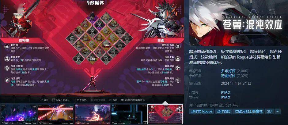 《苍翼:混沌效应》是由格斗IP苍翼默示录官方授权、91Act开发的国产2D动作游戏。游戏目前在Steam上的好评率为85%,刚在1月31日发布了正式版本,距今还不足一周。