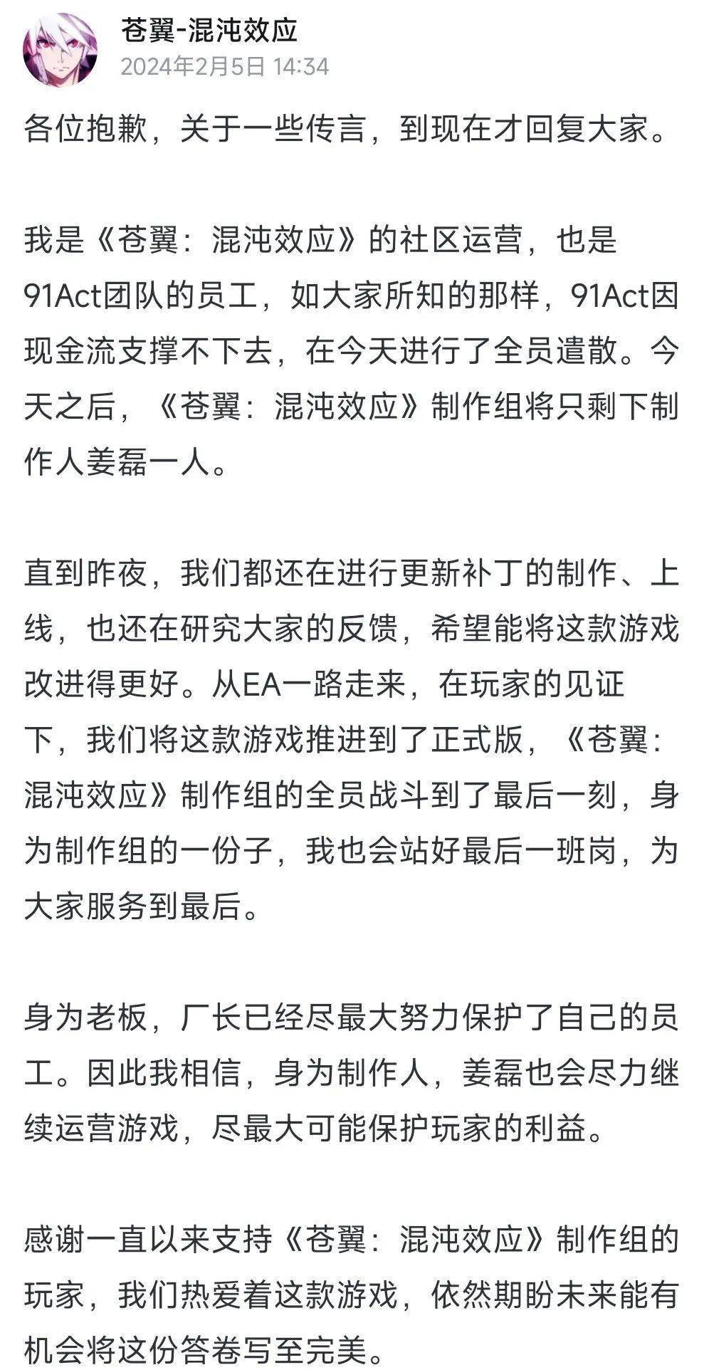 2D横版动作游戏《苍翼:混沌效应》的开发商91Act今日宣布,由于公司现金流无法继续支撑,在今天进行了全员遣散,制作组将只剩下制作人姜磊一人。