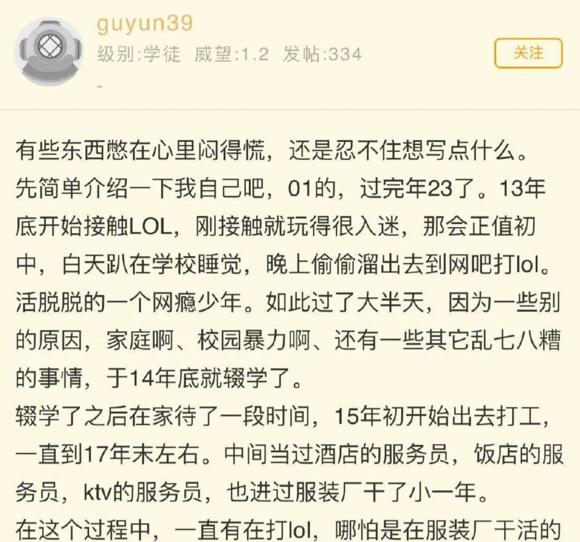 Guyun是01年出生,13年年底开始打英雄联盟,过程中因为家庭和校园暴力方面原因选择辍学,他自述自己的游戏天赋其实并没有那么好,15年,16年徘徊在钻石白金,17年才上大师,过程中在服装厂干活,每天都非常辛苦,同时还继续坚持每天大量游戏。