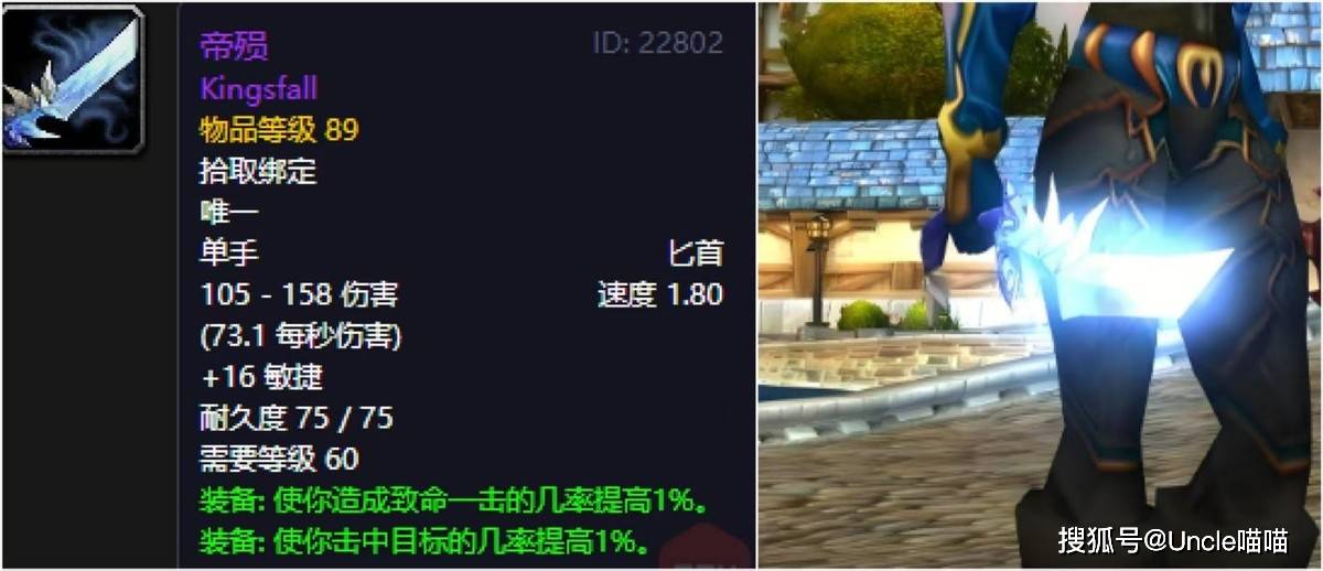 克尔苏加德的此款帝殒,名字确实威武霸气,就是造型太小家子气,他作为后期死亡之钉的最完美搭档,于匕首贼而言是必拿的神兵了,当然有理想敢出手的猎人大兄弟,其实拿他也着实不错,特别是搭配天使剑,那绿字面板属性是拉满状态的!