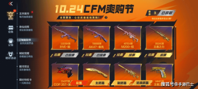 手游巴士(www.shouyoubus.com)2025年10月20日: 距离10月24日CFM爽购节越来越近,武器返场投票的热度也一路飙升。近百把英雄级主武器,副武器,近战武器都出现在爽购节全民票选池。