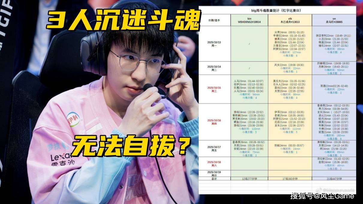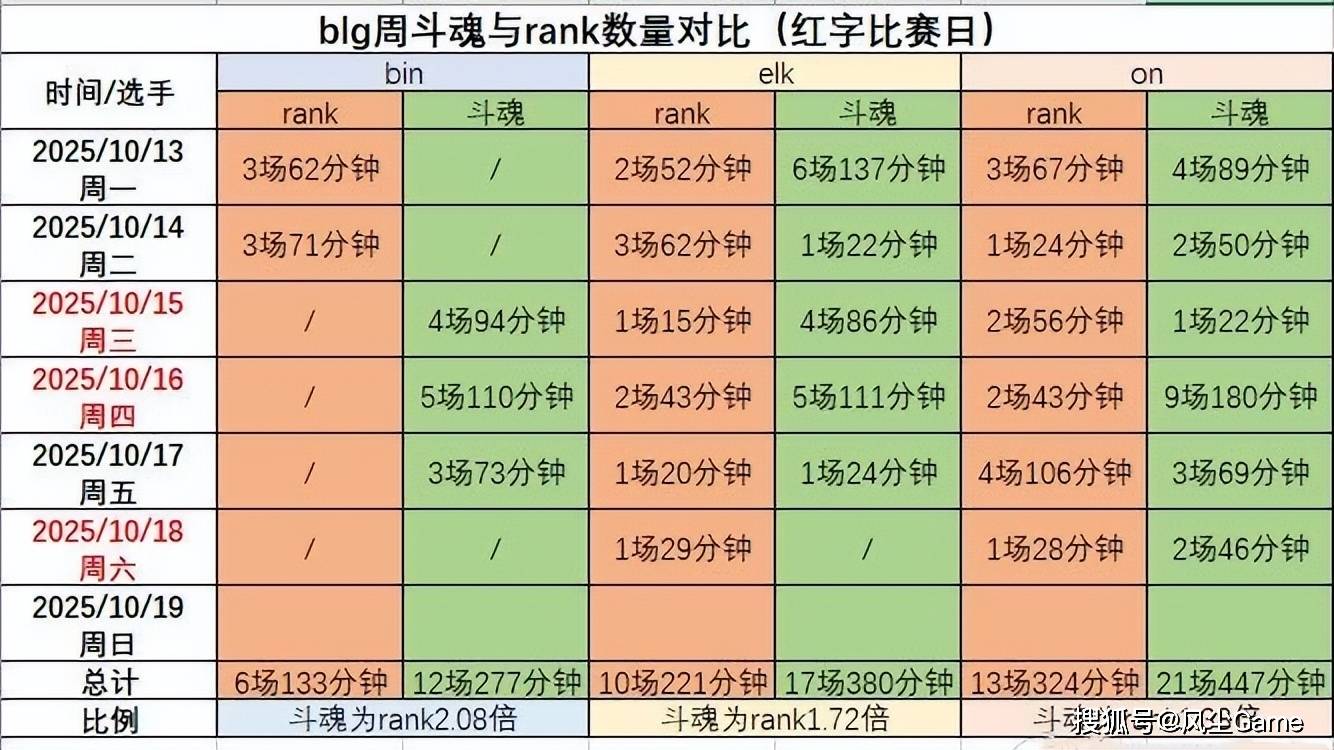 上路的Bin哥,上周玩了12场斗魂,但排位只打了6把,ELK比Bin还夸张,一周斗魂12次,不过排位他也打了10场,最离谱的是ON,上周斗魂21次全队最高,排位虽然打了13场,但场次比斗魂少多了,都面临淘汰了,还在玩斗魂,看BLG的选手们,是还没意识到,现在形势有多严峻啊。