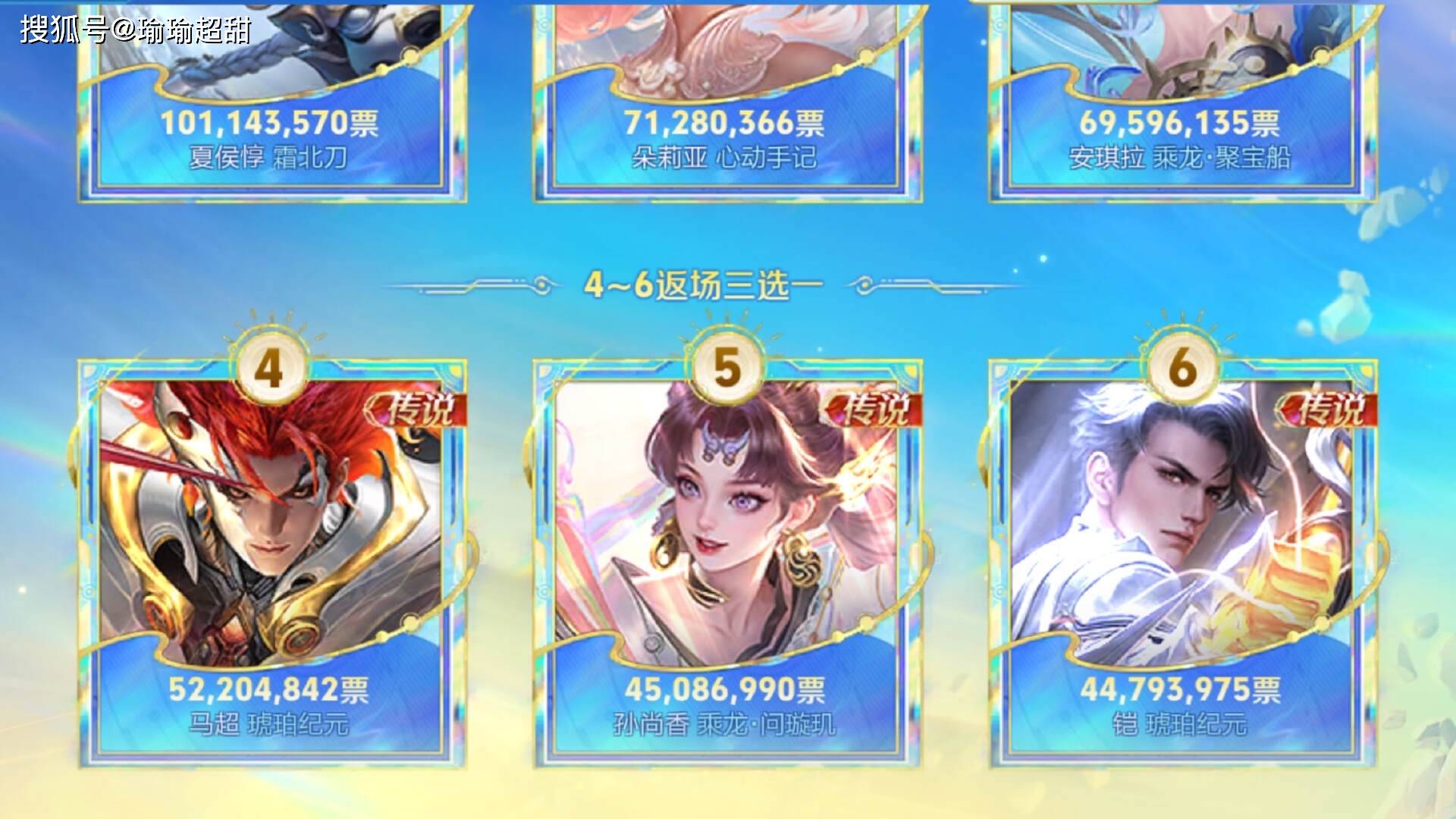 第4~第6名的皮肤有两款琥珀纪元系列的和一款龙年限定,没想到铠的琥珀纪元在后面能够反超赵云貂蝉等,实际上孙尚香、铠、赵云和貂蝉的传说限定皮肤票数相差并不是很大,但最终貂蝉和赵云落选了,貂蝉的票数其实只差一点点,对于喜欢貂蝉敦煌皮肤的玩家来说也是比较可惜的。